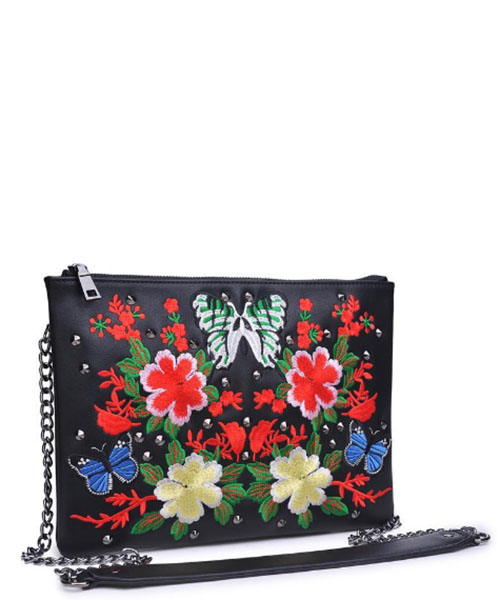 Bag Type: Crossbody Material: Embroidered Vegan Leather Closure: Zipper Exterior Details: Embroidered floral design, metal stud accents Inside Features: Fabric lined, 2 slip pockets, 1 zip pocket Extras: Detachable chain strap 12.20 "L x 1.00 "W x 12.60 "H