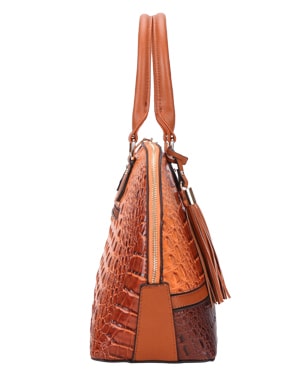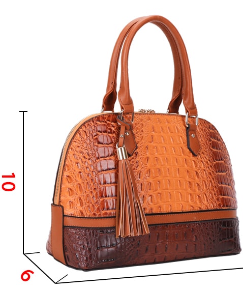 2in1 Crocodile Skin Satchel Wallet Set Crocodile Faux vegan leather Zip top closure Gold-tone hardware Detachable shoulder strap 2-in-1 Bag (Satchel & Wallet) Bag-wallet set Size: L 13 x H 10 X W 6 (5 D) Size: L 7.5 X H 4 X W 1 Tasseled Accent