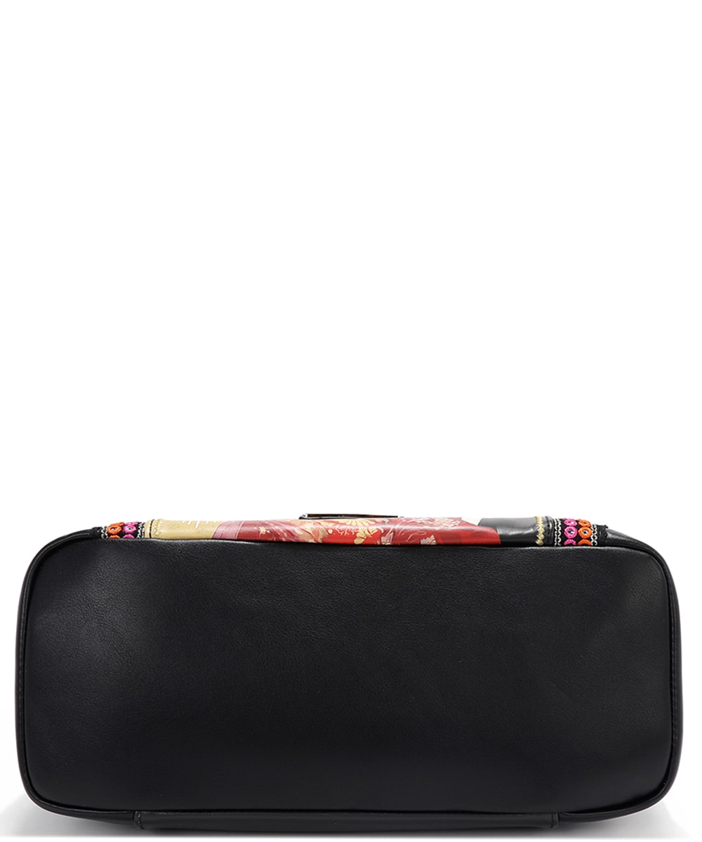 Front is embellished with multicolored beads, flowers, and gold metal leaf motifs