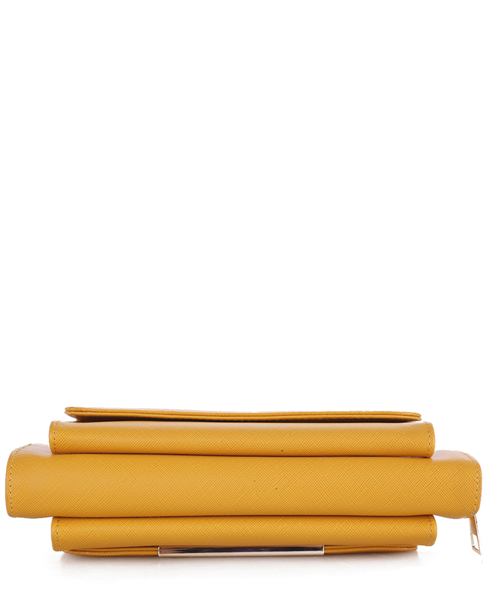Dimensions - 8.5"L x 1"W x 3"H Optional chain strap Saffiano faux-leather Gold-tone hardware 3 compartments, center zipper divider, 8 credit card slots, 2 bill slots Exterior - 1 front and rear compartments Closure - zipper and magnetic snap