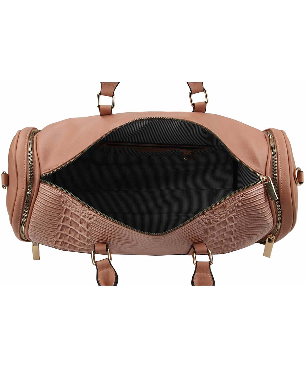 Featuring a crossbody strap that works perfect for travel, this embossed satchel is a timeless piece that brings double the versatility to your collection. * 1 back zip pocket. * 10.5L double handles 22L detachable strap. * Faux leather with lined interior. * 2 interior slip pockets & 1 zip pocket. * Top zip closure. * Gold hardware. * Tablet compatible (std. size 8-10in). Approximate Size: 19L x 11H x 8.5W