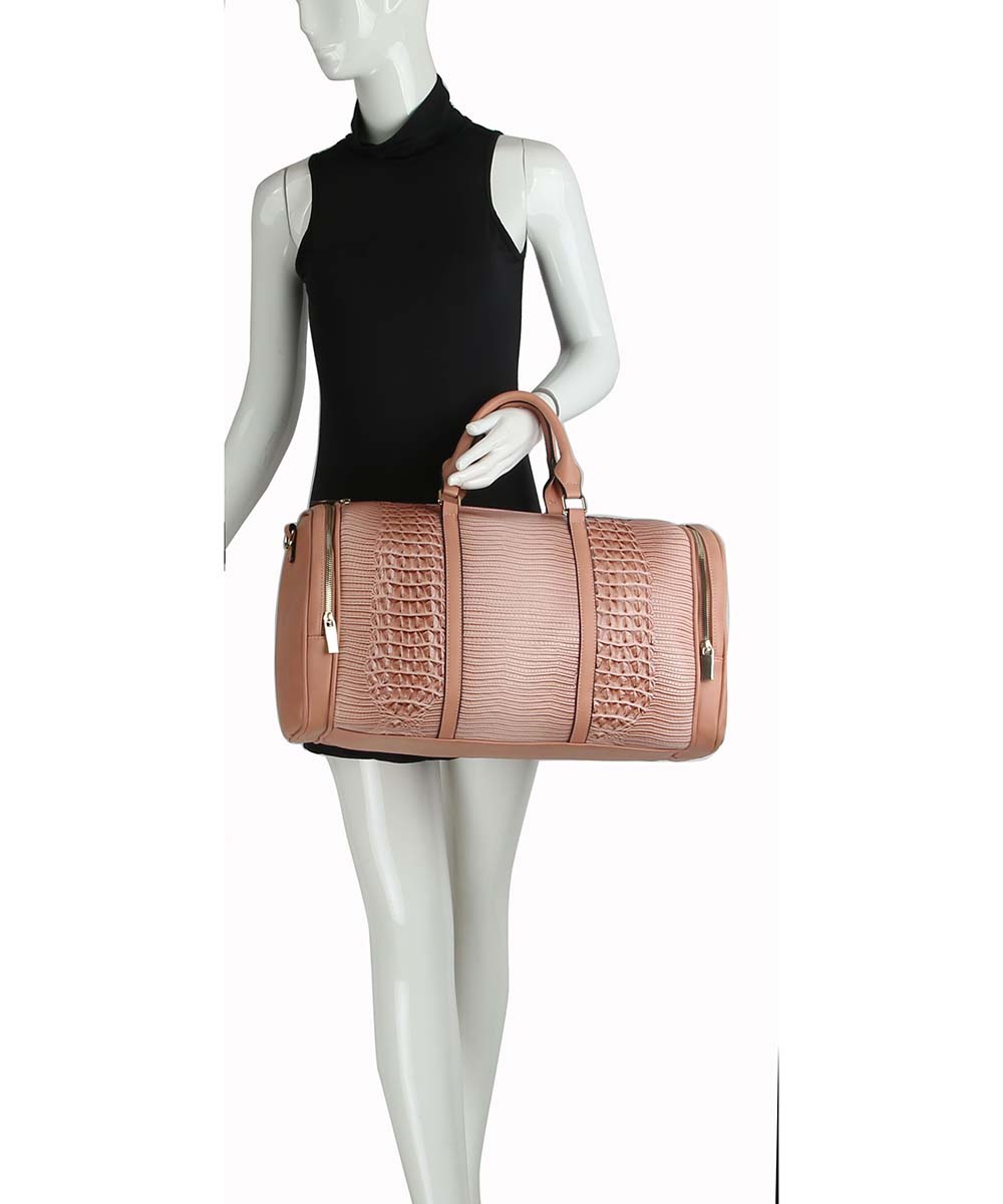 Featuring a crossbody strap that works perfect for travel, this embossed satchel is a timeless piece that brings double the versatility to your collection. * 1 back zip pocket. * 10.5L double handles 22L detachable strap. * Faux leather with lined interior. * 2 interior slip pockets & 1 zip pocket. * Top zip closure. * Gold hardware. * Tablet compatible (std. size 8-10in). Approximate Size: 19L x 11H x 8.5W