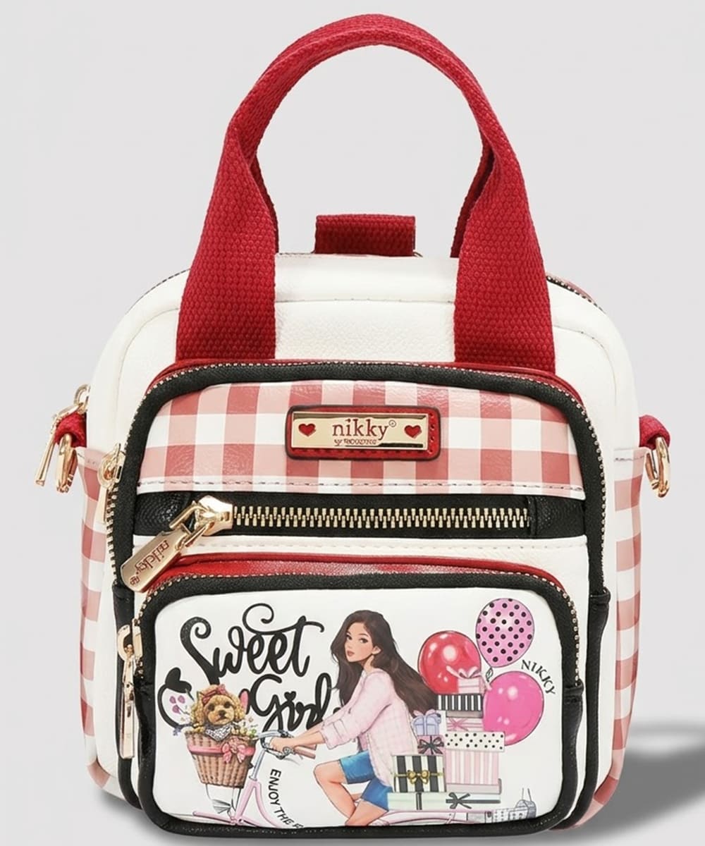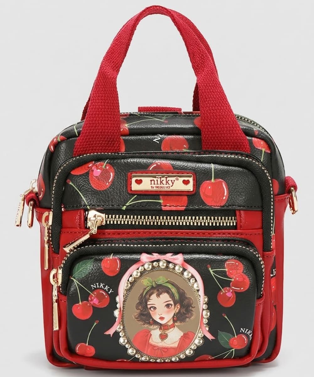 Main zipper closure with Nikky logo engraved zipper pull.