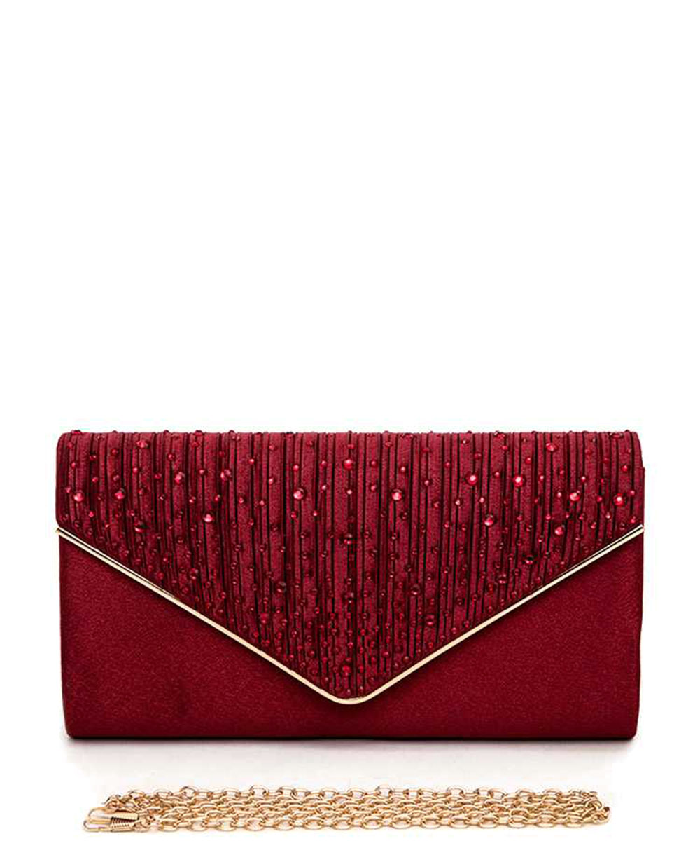 Crystal Pave Pleated Satin Clutch Bag 136-21036 BURGUNDY
