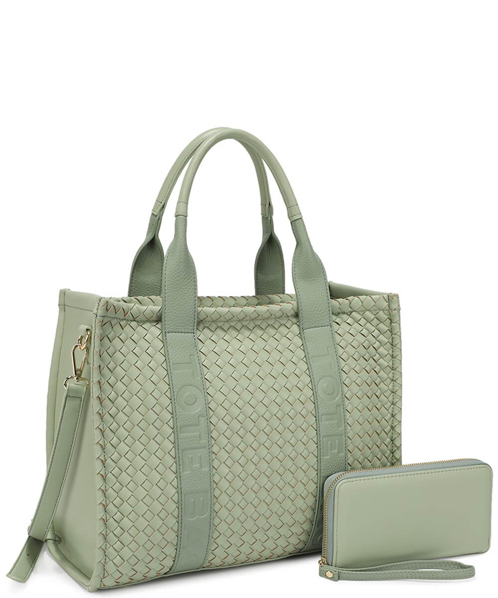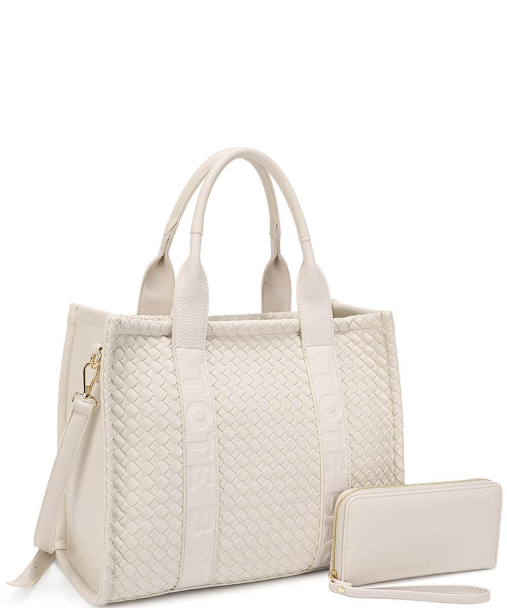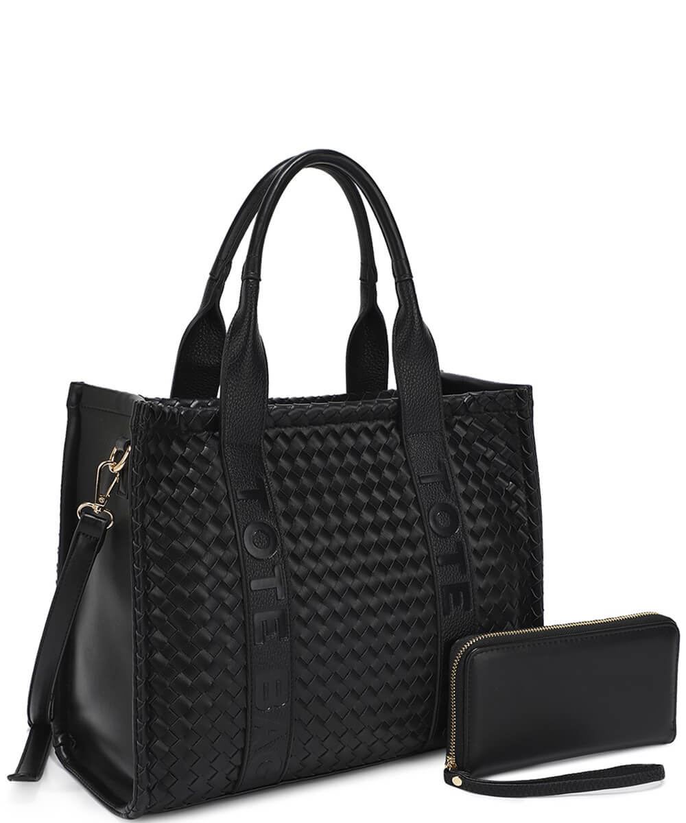 Fashion Faux Leather Woven Tote Bag + Wallet Set