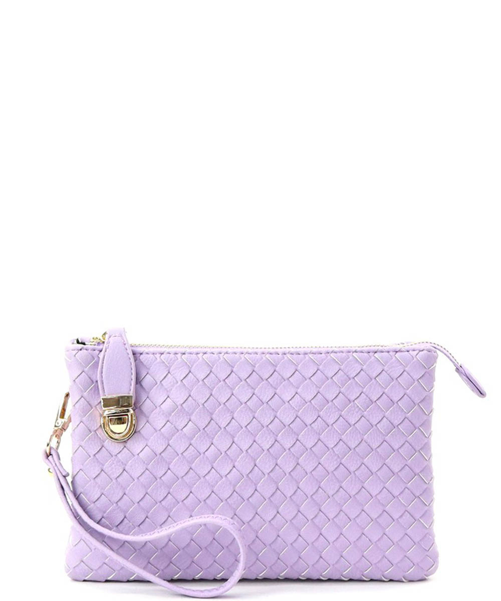 Material:Faux Leather Size: 9.5" L X 2.5" D X 6" H *Fashion Faux Woven Leather Messenger Bag with Buckle *Zipper Top with Buckle Clasp Closure *5 Separate Compartments (3 Open 2 Zipper) *Inside Zipper Pocket + Open Pockets *Adjustable Shoulder Strap Included *Wristlet Strap Included *Monogram Ready