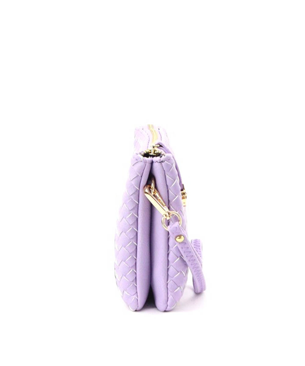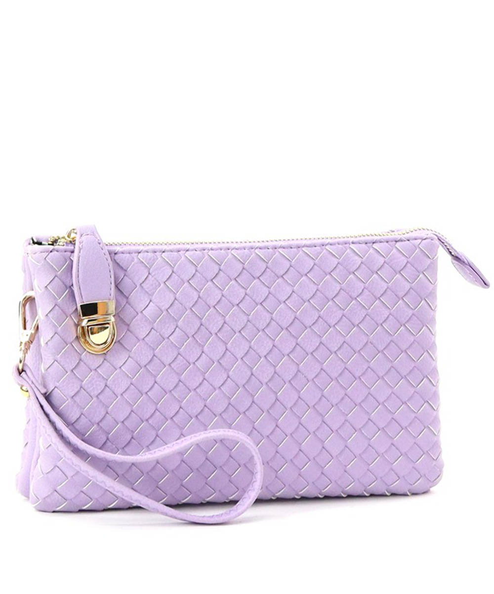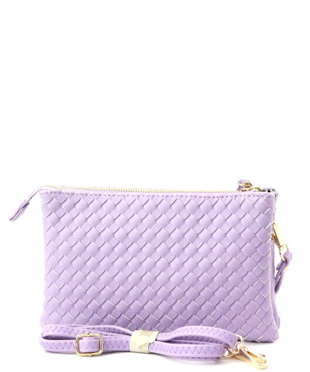 Material:Faux Leather Size: 9.5" L X 2.5" D X 6" H *Fashion Faux Woven Leather Messenger Bag with Buckle *Zipper Top with Buckle Clasp Closure *5 Separate Compartments (3 Open 2 Zipper) *Inside Zipper Pocket + Open Pockets *Adjustable Shoulder Strap Included *Wristlet Strap Included *Monogram Ready