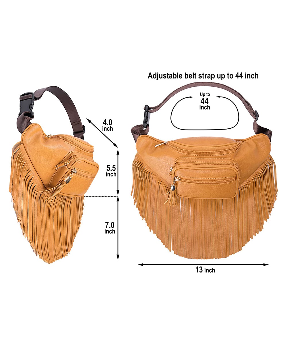 Fashion Fringe Tassel Fanny Pack Waist Bag Faux leather Zip top closure Gold-tone hardware Adjustable strap L 13 * H 5.5 * W 4 Front Side Multiple Pockets Zipper with Tassel Inside Space Main compartment with inner side zipper pocket inner side open pocket Back Side Back Side Zipper Adjustable Belt FannyPack Handbag Shoulder bag Crossbody bag