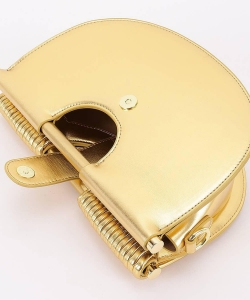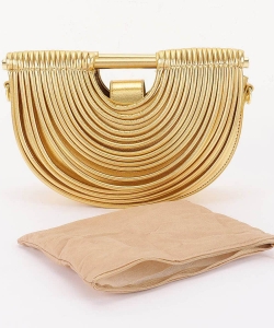 This is a Metallic Faux Leather Noodle Bag It features a unique half moon silhouette, crafted with multiple parallel, vertical “noodle - like” strips of metallic faux leather, creating a textured and sculptural look. A sleek, rectangular metal bar runs horizontally at the top, acting as both a structural and decorative element. The bag comes with an adjustable, detachable metallic shoulder strap, allowing for crossbody or shoulder carry. Its compact size is perfect for holding essentials. Ideal for evening events, fashion parties, or stylish urban outings, it pairs well with minimalist dresses, jumpsuits, or monochromatic outfits to add a modern, edgy touch.
