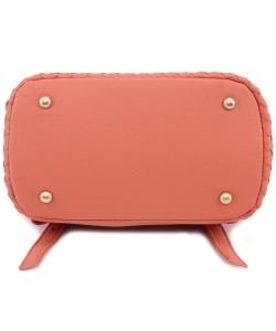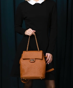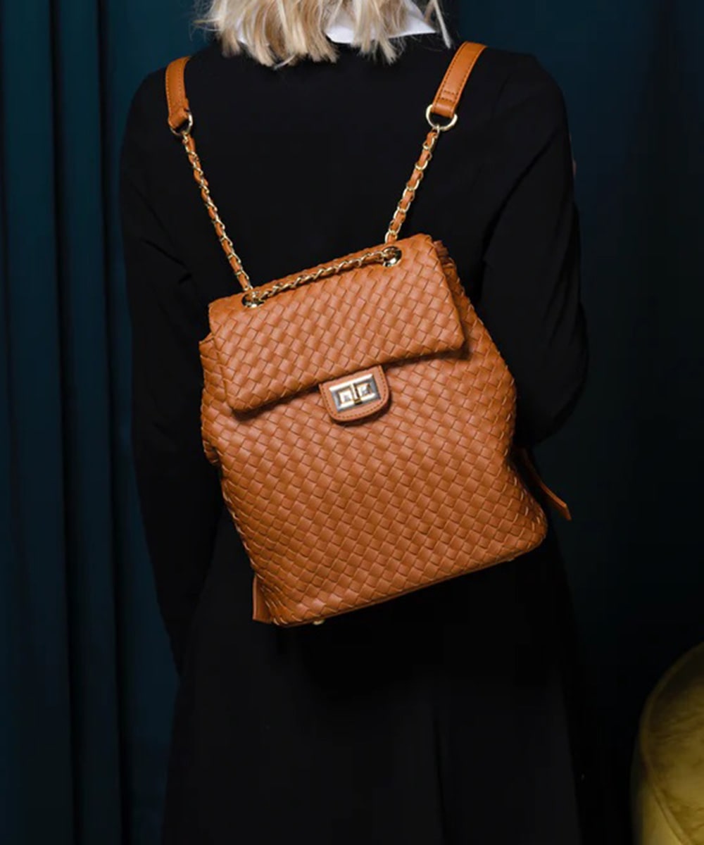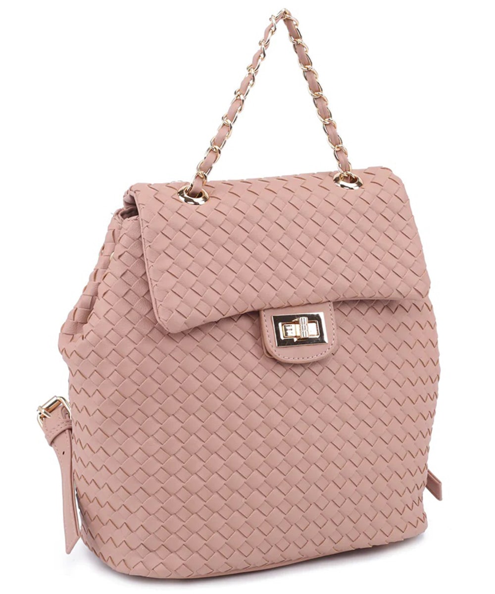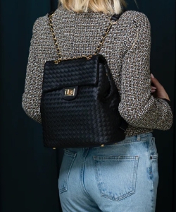 Charlotte is a classic on the go. Smooth woven vegan leather, flap over entrance with a functional turn lock. chain top handle, smooth backpack straps. Interior zip pocket, Interior slip pocket. Cinching side snaps.