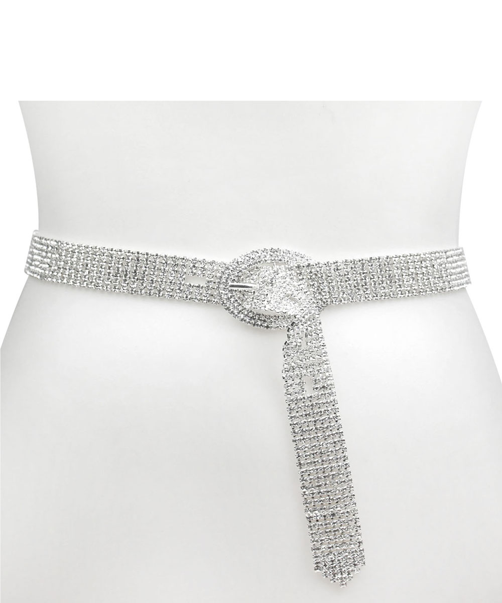 Gleaming crystals add opulent shine to this belt\ No buckle holes for an adjustable fit Measures 1.5"W x 40"L 2" Buckle In glass crystal/aluminum Imported