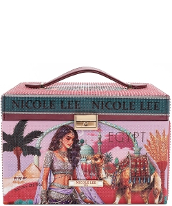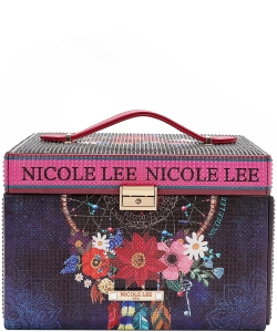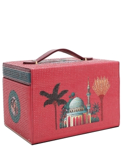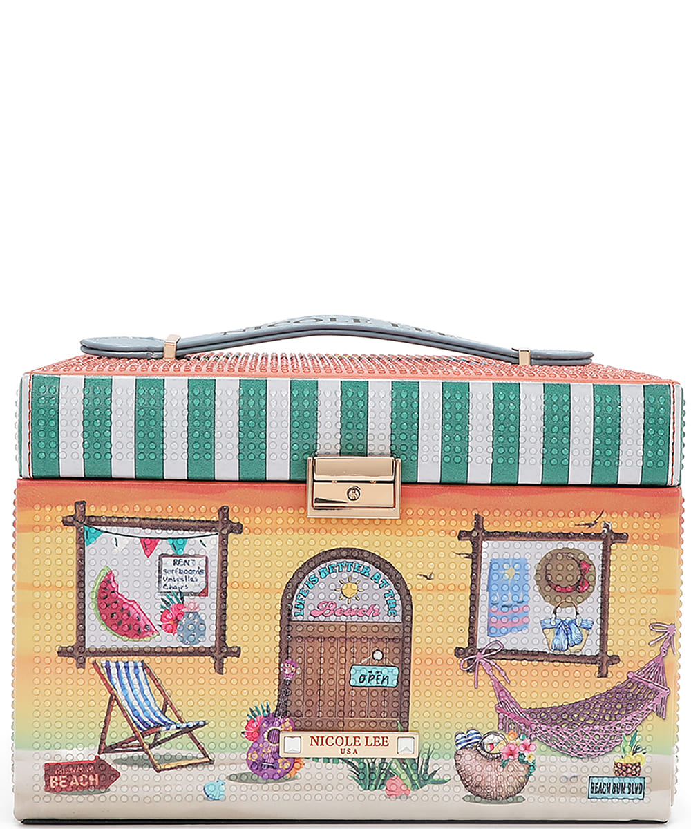 Lid opens to reveal a mirror, ring and earring storage, necklace hooks, and jewelry