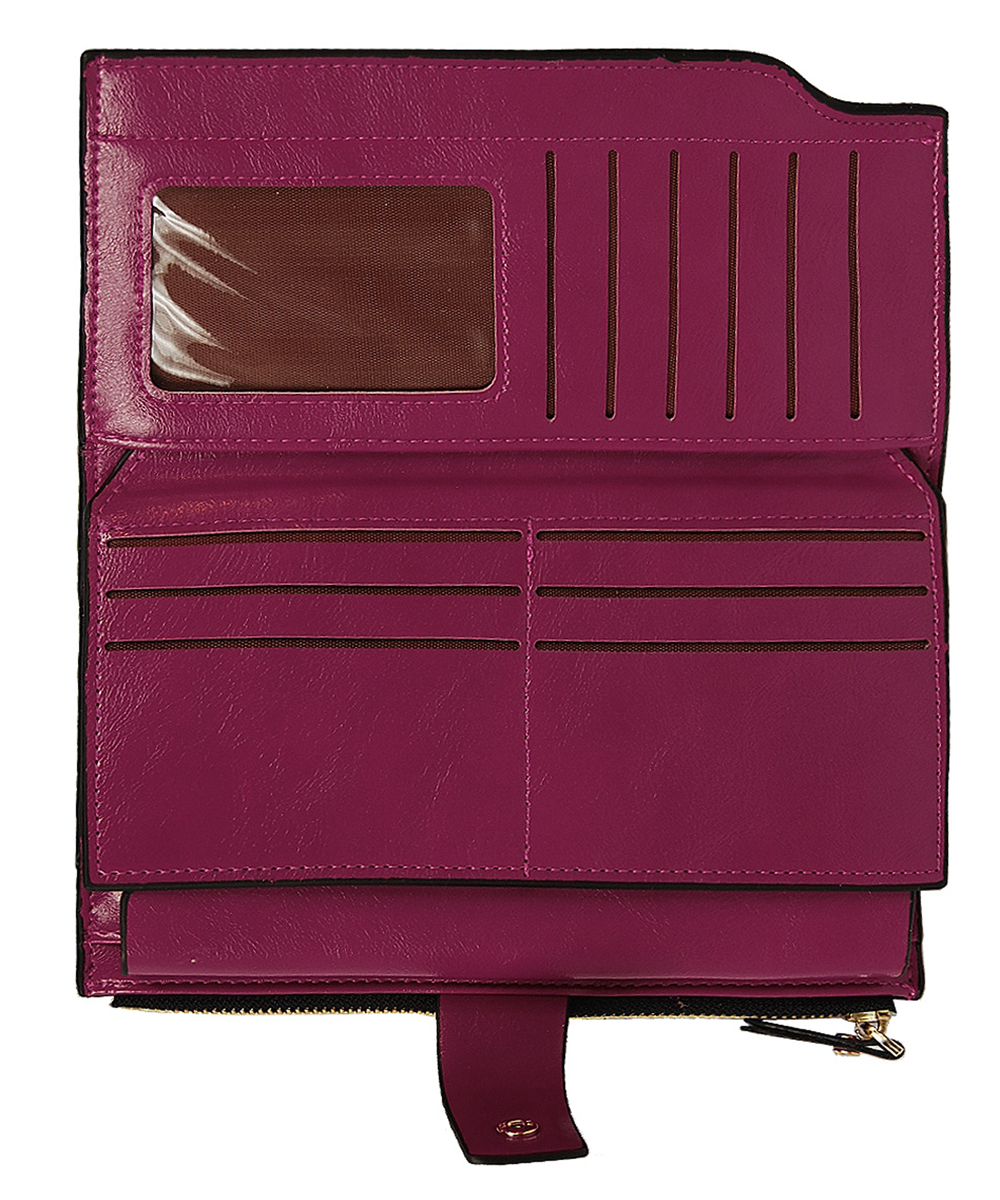 EXTERIOR DIMENSION: 7.5"L X 1.5"W x 4"H MATERIAL: Smooth faux leather with matching trim Gold plated hardware DETAILS: Wallet fold button and zip closure Interior 12 card slots Hand strap included