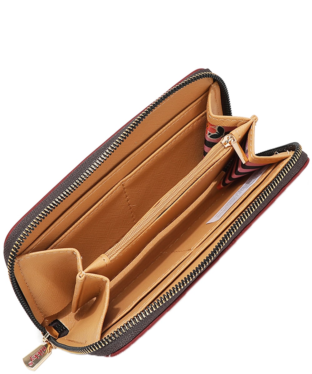 Wrap-around zip closure 2 note slots, 4 card slots, and center zip coin compartment.