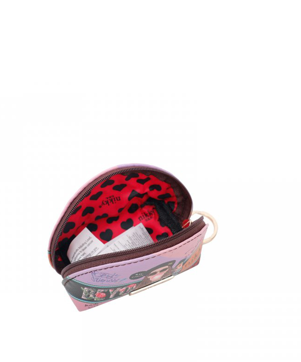 Use this small half moon coin purse to help keep you organize with fun and style on the go. Exterior Features: Made of eco-leather. Nikky Logo Nameplate at front. Main Zipper closure with keyring fob. Interior Features: Spacious interior. Lined with signature Nikky nylon heart print fabric. For cleaning, wipe with damp cloth.