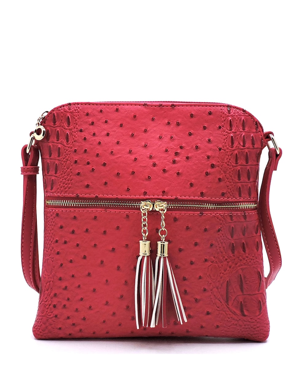 Ostrich Croc Zip Tassel Crossbody Bag OS062 FUSHIA