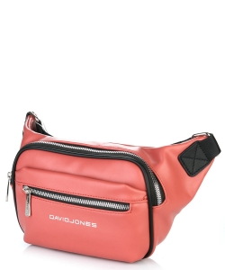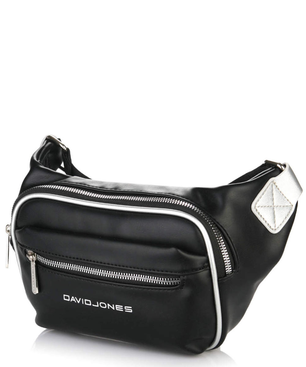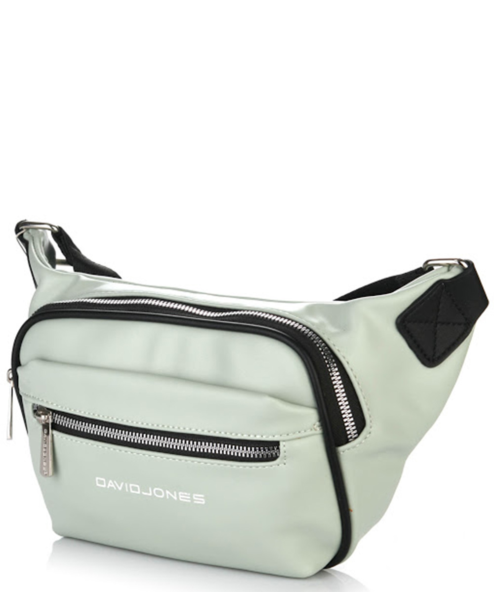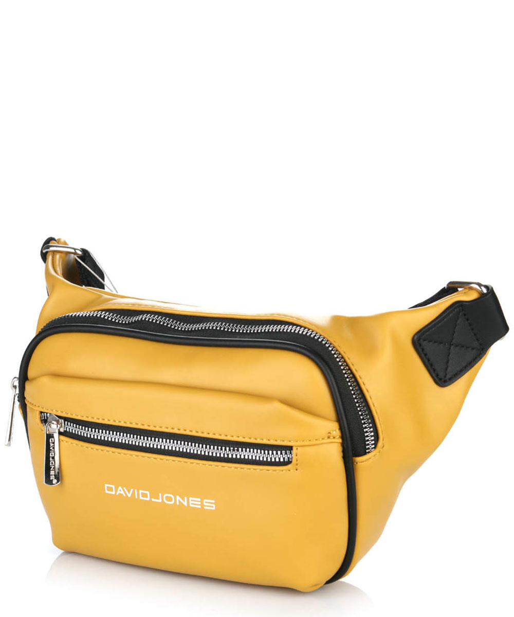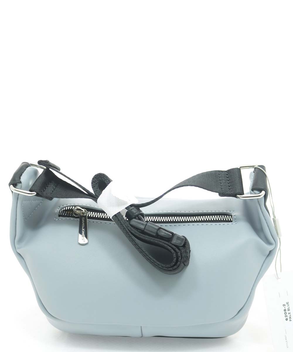 Fashionable women's banana bag for a belt or over the shoulder, made of artificial leather. Silver-colored hardware. The strap length is adjustable. Inside the main compartment, a zip pocket and an open sewn pocket. On the front and back sides, there are also horizontal zippered pockets.