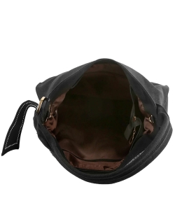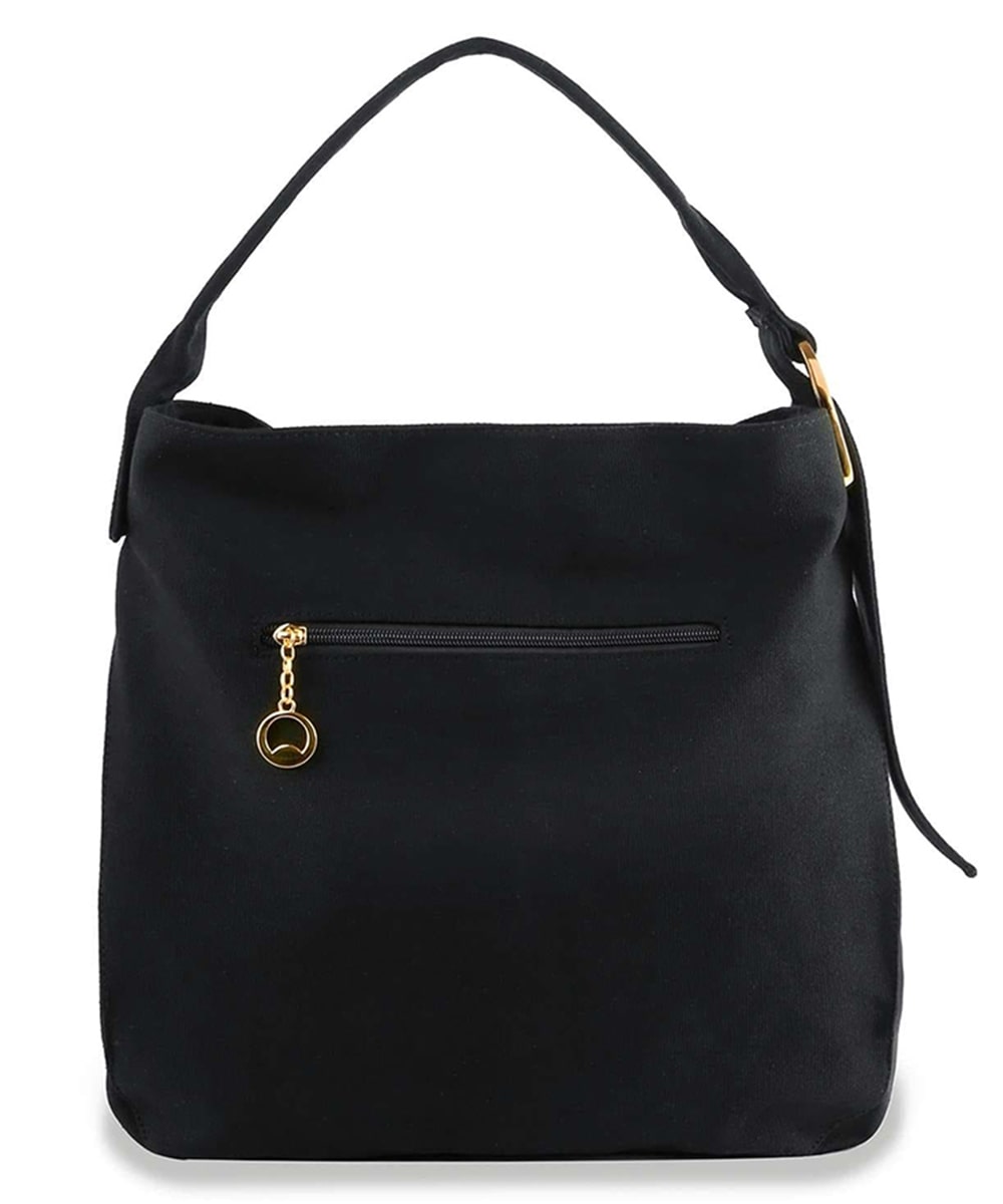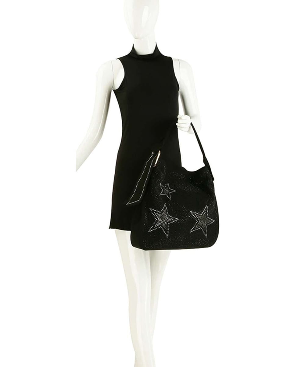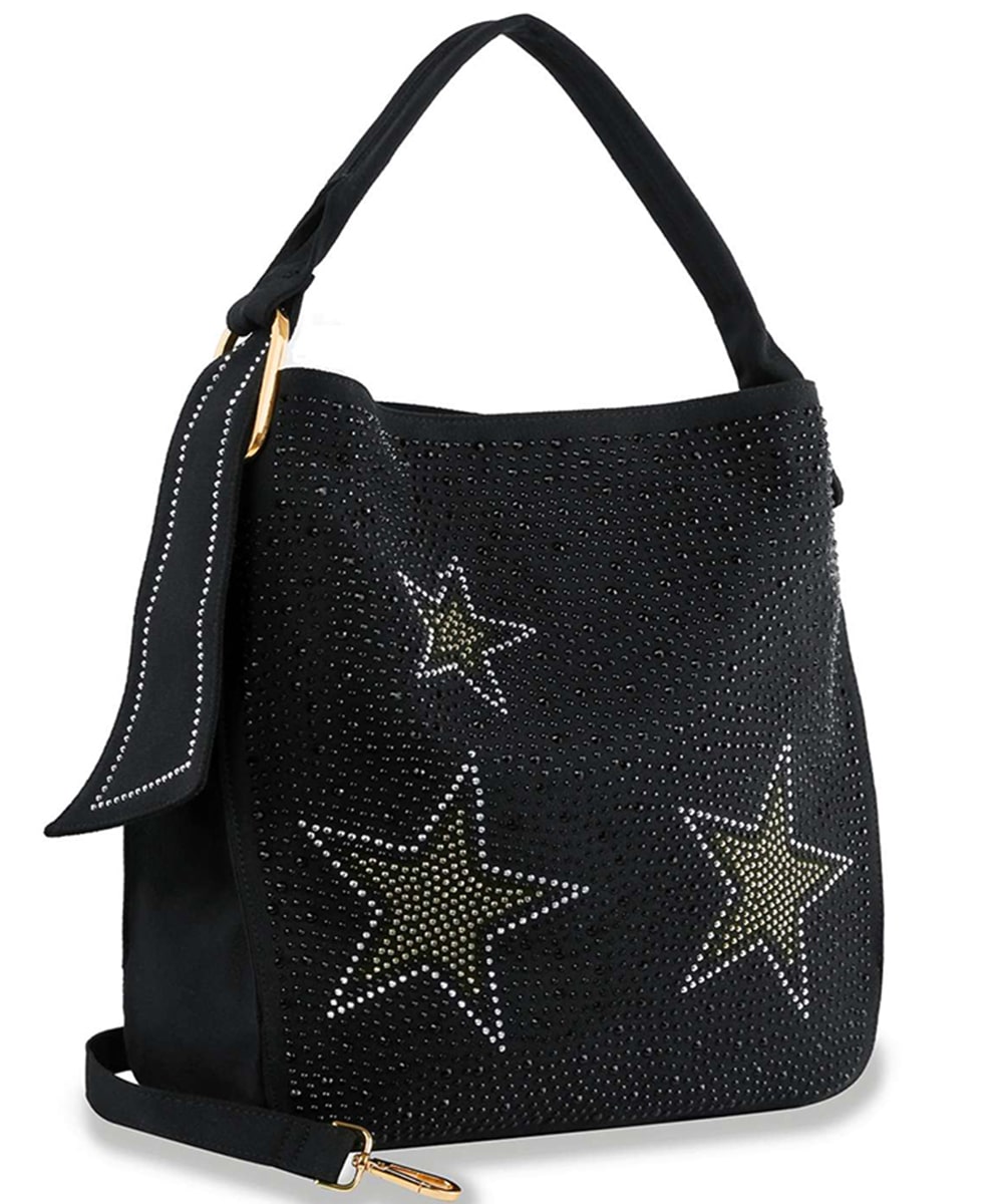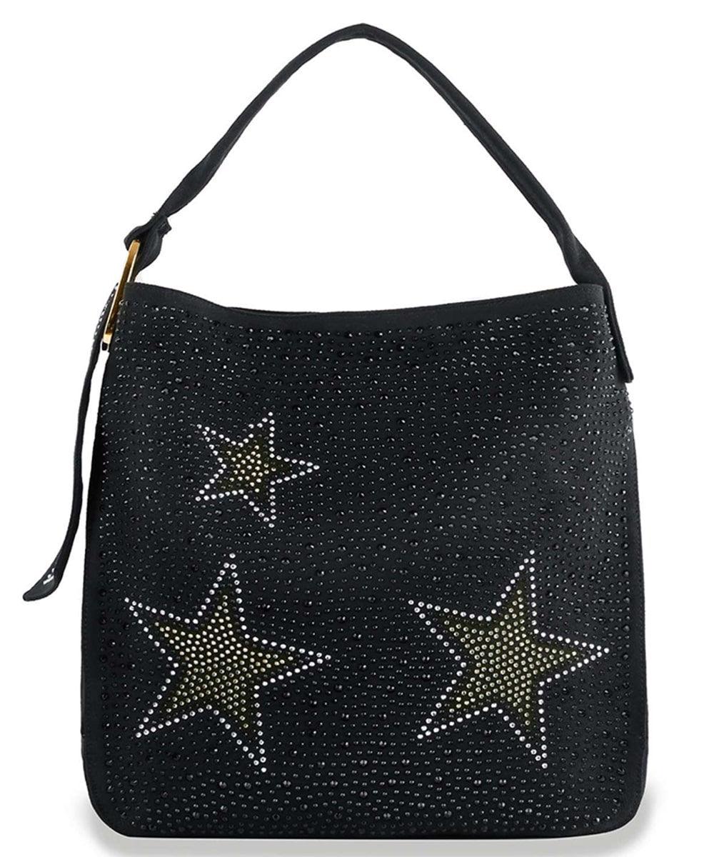 Rhinestone stars shine against the inky denim of an unstructured shoulder bag for casual glam.