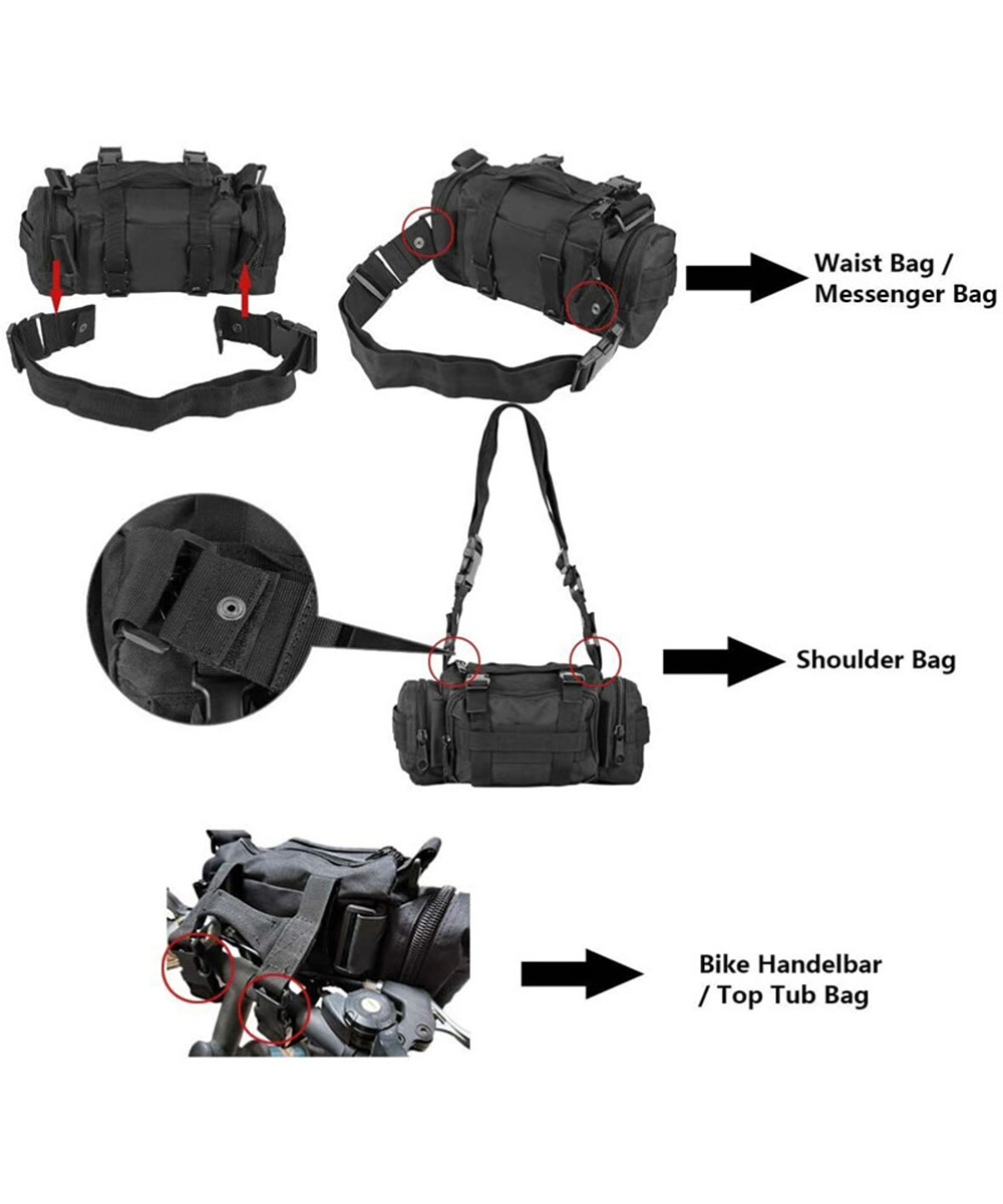 1. Size: 13.8" x 7" x 5.5". Multi-purpose Bike Handlebar Bag - OUTDOORS multi-purpose handlebar bag with adjustable strap can also be used as bike top tube bag, shoulder bag, waist bag and messenger bag. Hang it on handlebar as sixth image shows please. Appropriate size fits for most people.