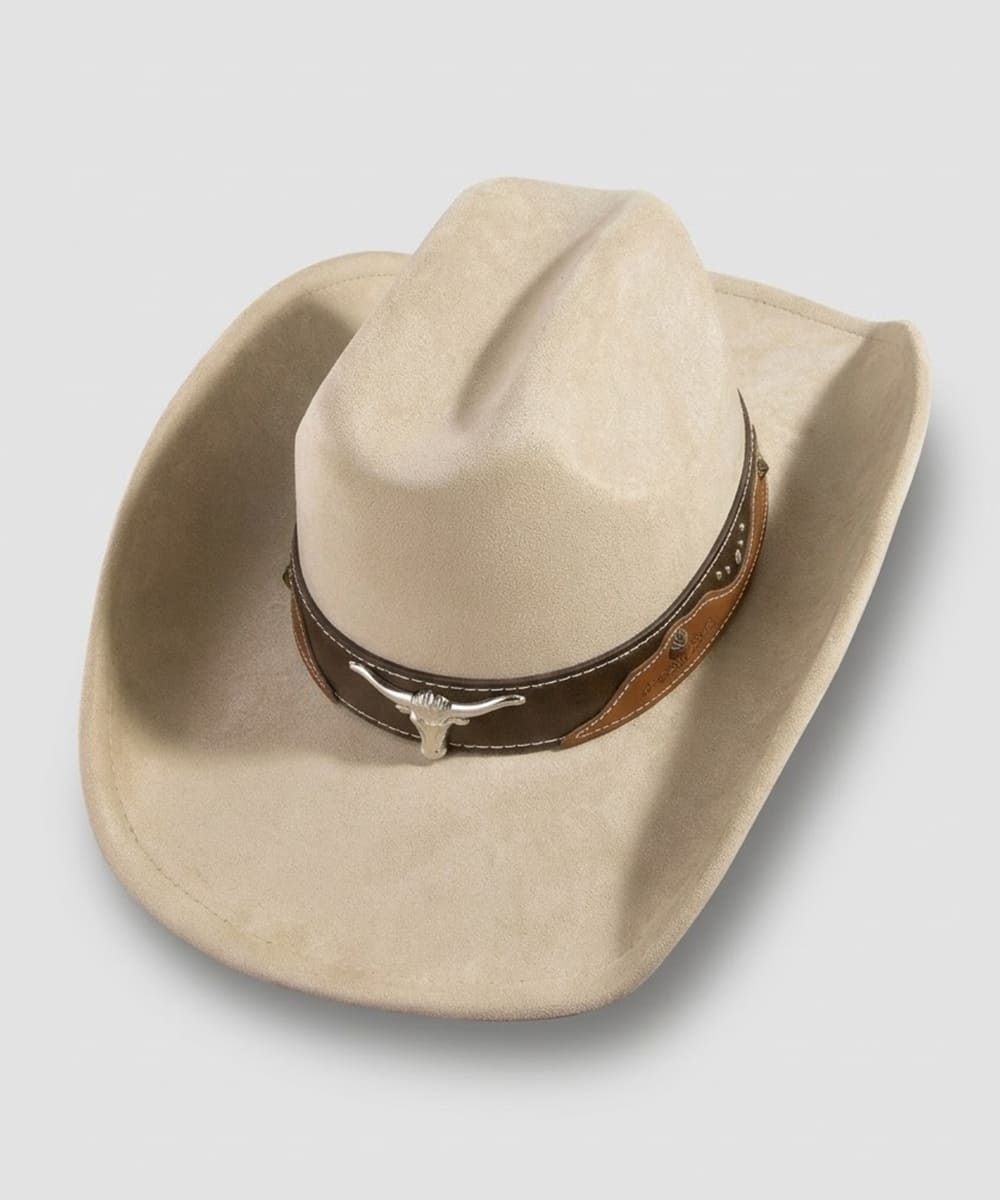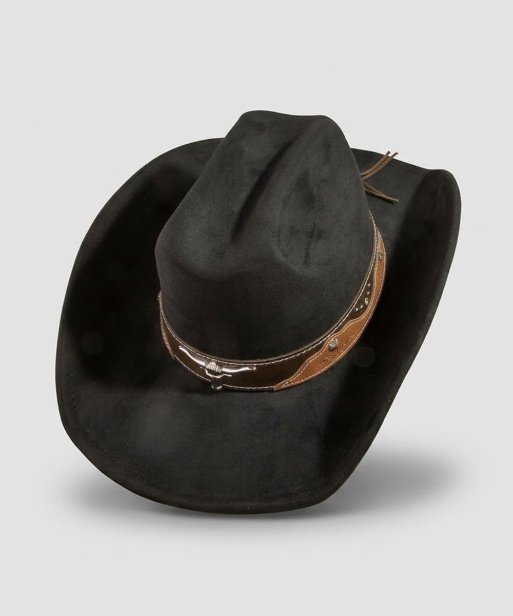 A contemporary masterpiece, this cowboy hat introduces an exceptional western long horn faux leather strap design. Achieve a perfect blend of style and sophistication with this versatile cowboy hat, a fashion-forward choice for any occasion. Available in BK, CO, LBR, TP. This item is sold in packs of 1.
