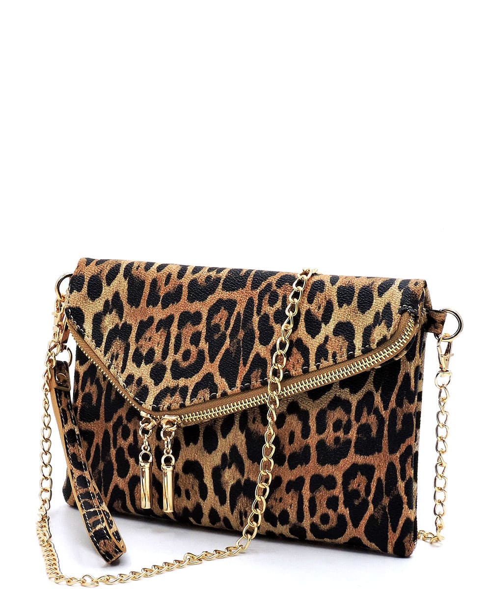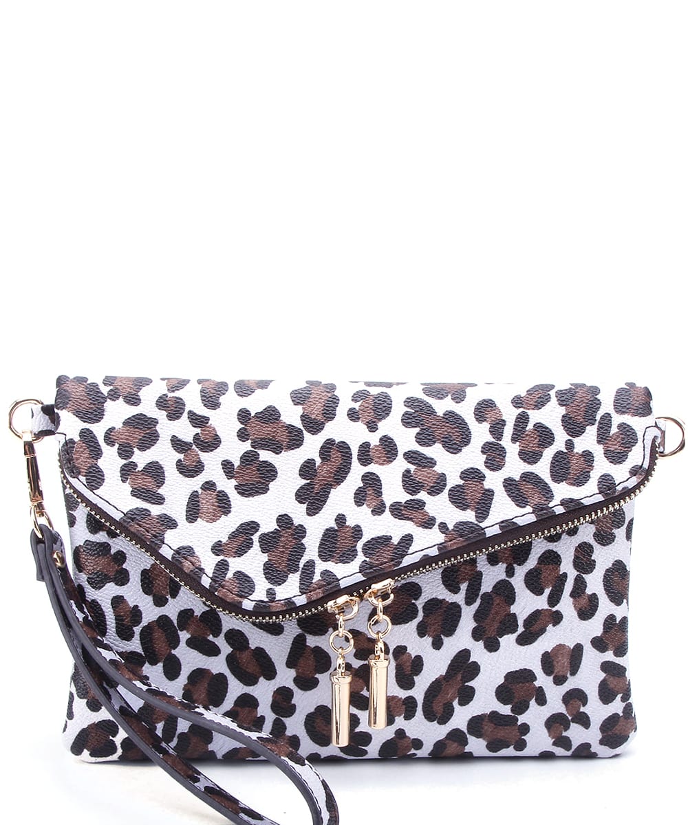 White Leopard Envelope Foldover Clutch Crossbody Bag LE023 WHITE BROWN