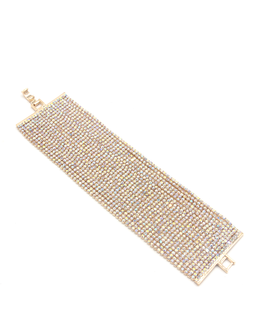 The silver tone bracelet presented, circa 1950s-1960s, features eight rows of pronged, sparkling clear chaton rhinestones secured with a box clasp and detachable safety chain. The bracelet is fully articulated for fit and flexibility and strategically soldered for stability and strength. It measures approximately 7 inches x 1 1/2 inches wide with a 1/8 inch height. Chatons are about 4 millimeters. Weight of the bracelet is approximately 60 grams.